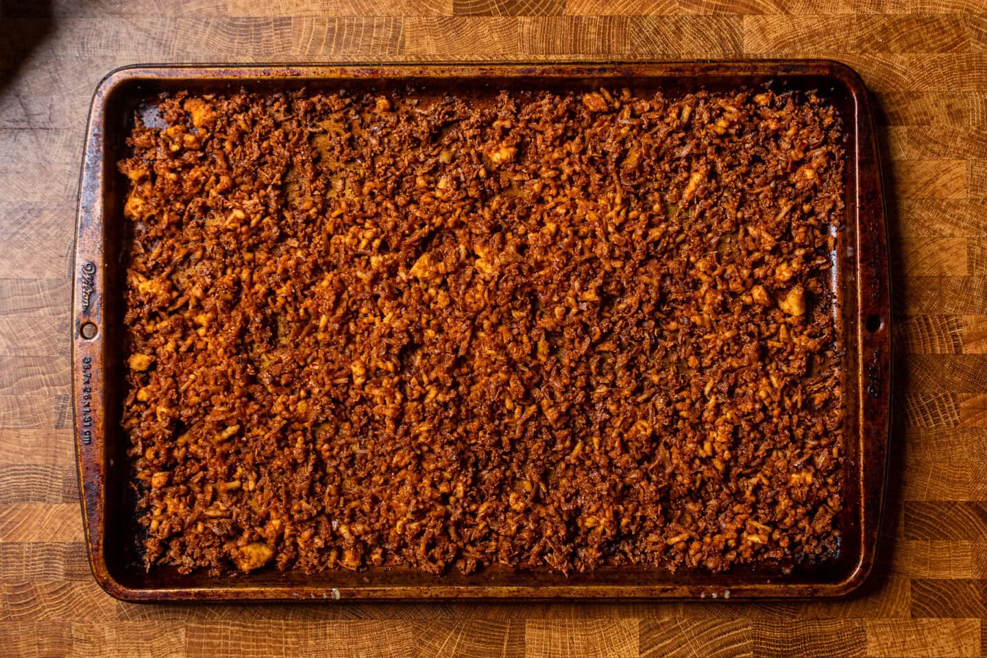 - Bake 22–28 minutes, stirring once halfway through, until edges are darkened and slightly crispy. Set aside.