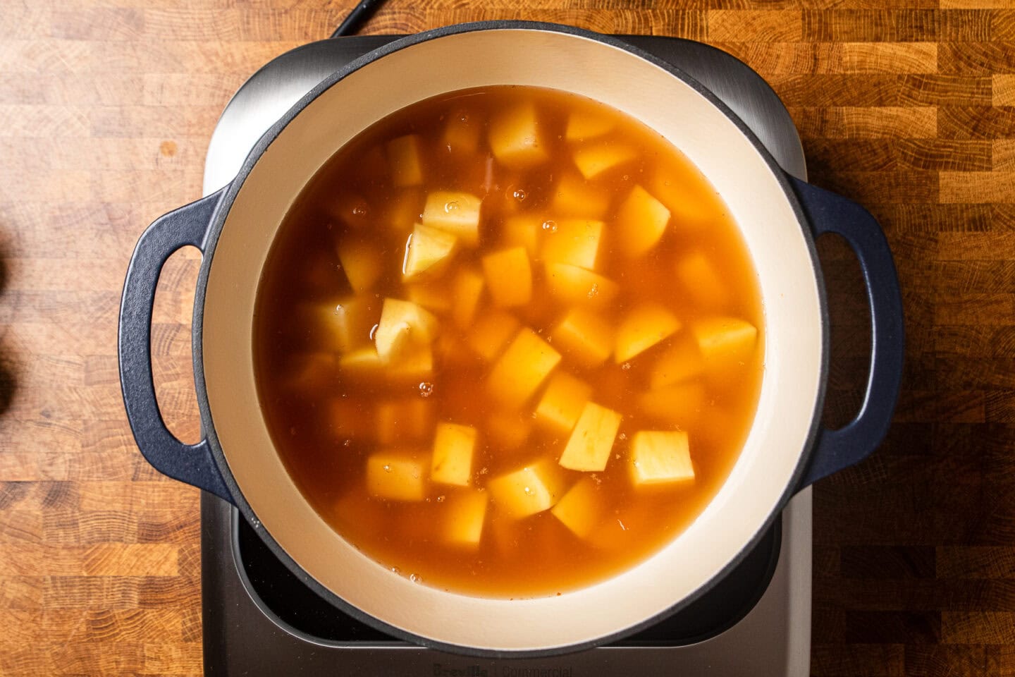 - Add your potatoes to a pot with the stock then turn on the heat. Otherwise, you’ll end up with unevenly cooked potatoes.