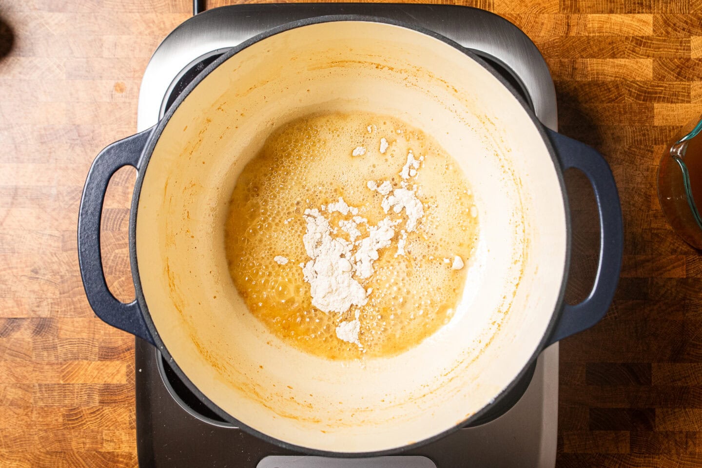 - In the same pot, add 3 tablespoon butter over medium heat and let melt. Add in 3 tablespoon flour. Whisk constantly until a paste forms and smells nutty (about 2-3 minutes)(This makes a roux).
